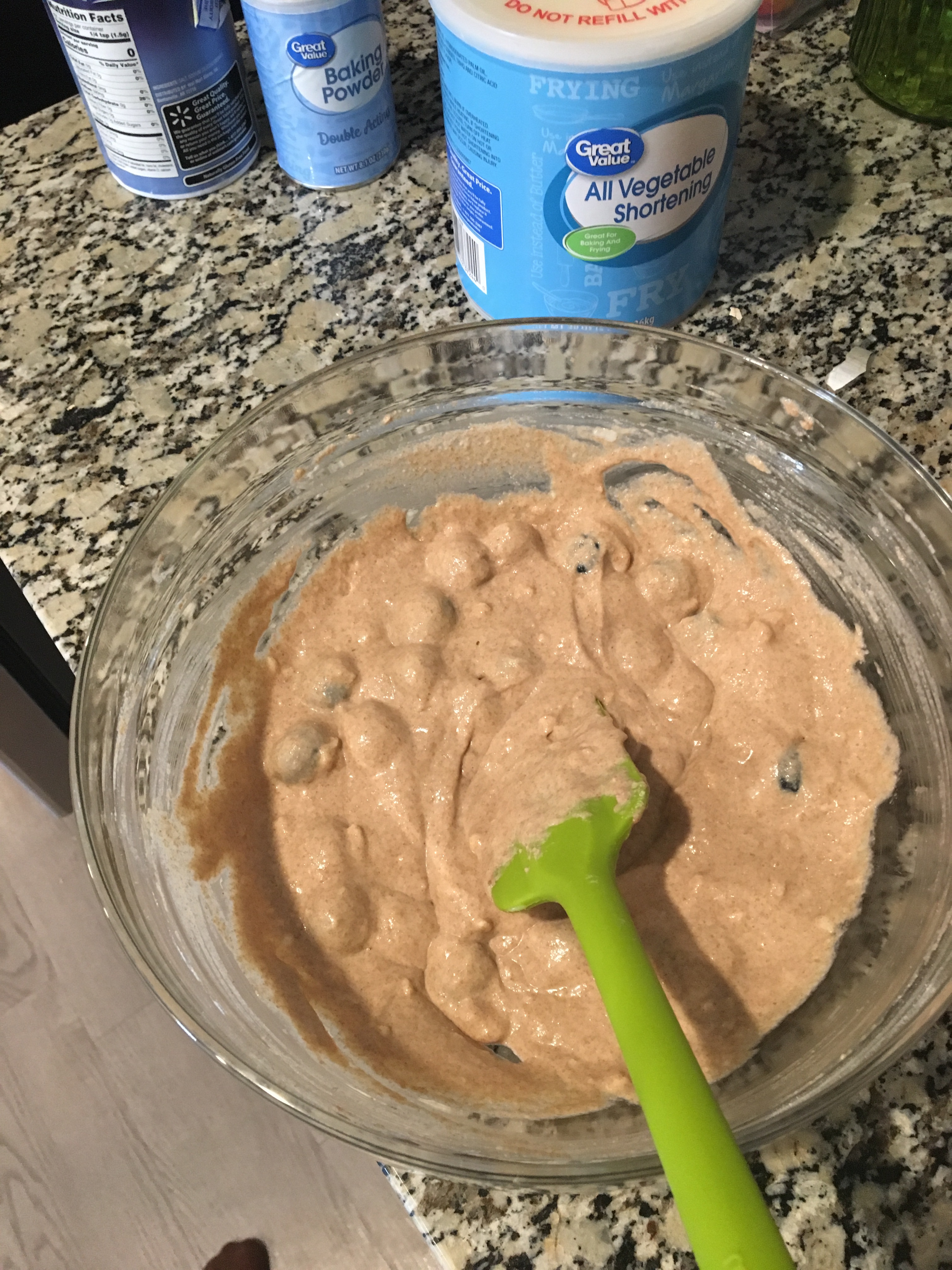 Honestly, I was a little nervous. I had never used vegetable shortening in a pancake recipe and it looked a little weird when I plunked it into my batter. It did not work well. I again remembered stand up mixers, and how I don’t own one. Please, use a stand up mixer.
