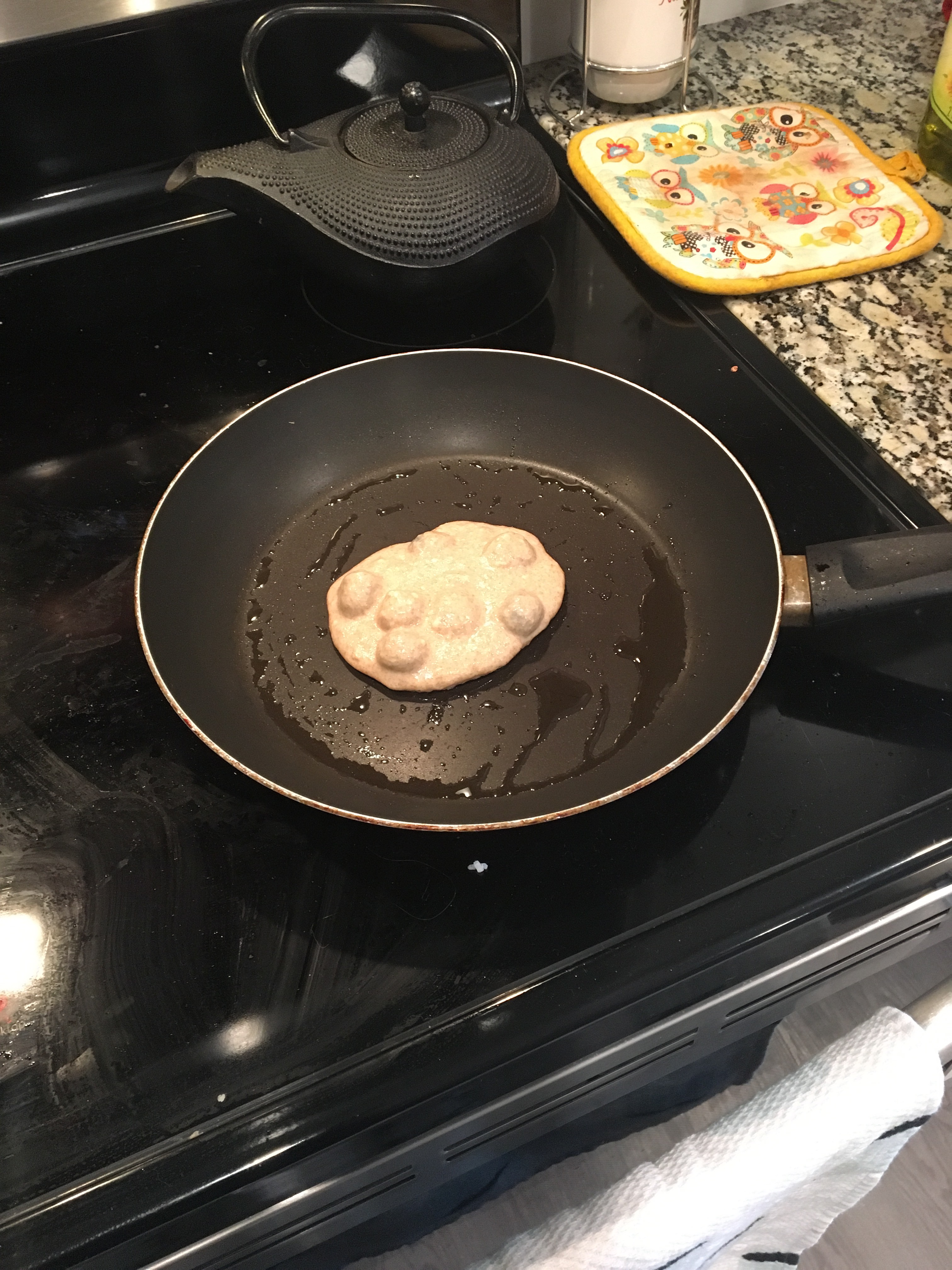 - Heat a pan on low with olive oil. When the pan feels warm to your hand, add batter.