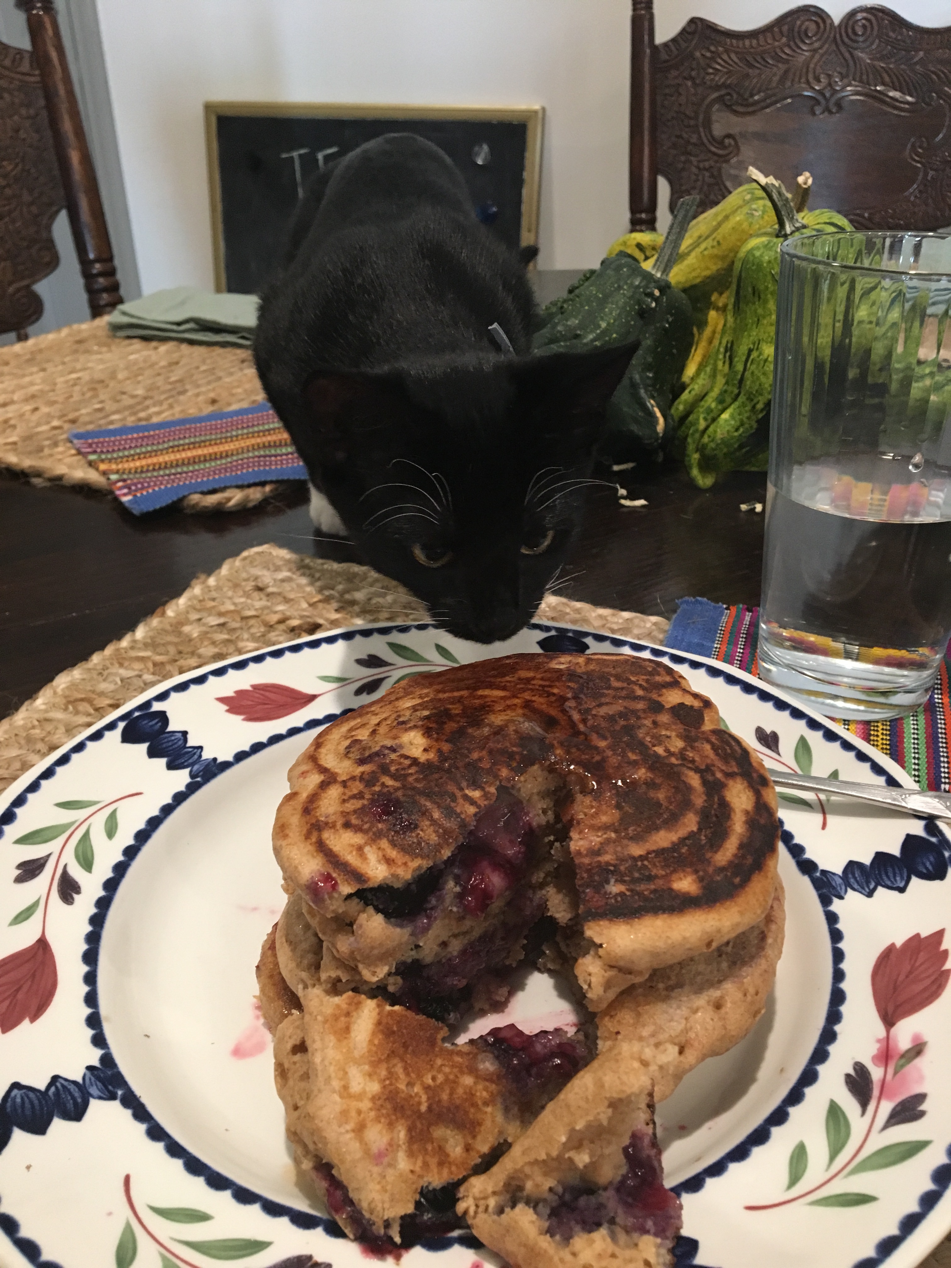 I pressed on and had a delightful idea. When I was younger, on special days, my siblings and I got to have not just pancakes but BLUEBERRY PANCAKES. We had them so rarely it was like the world’s best breakfast. And can you guess what I had in my fridge this morning?