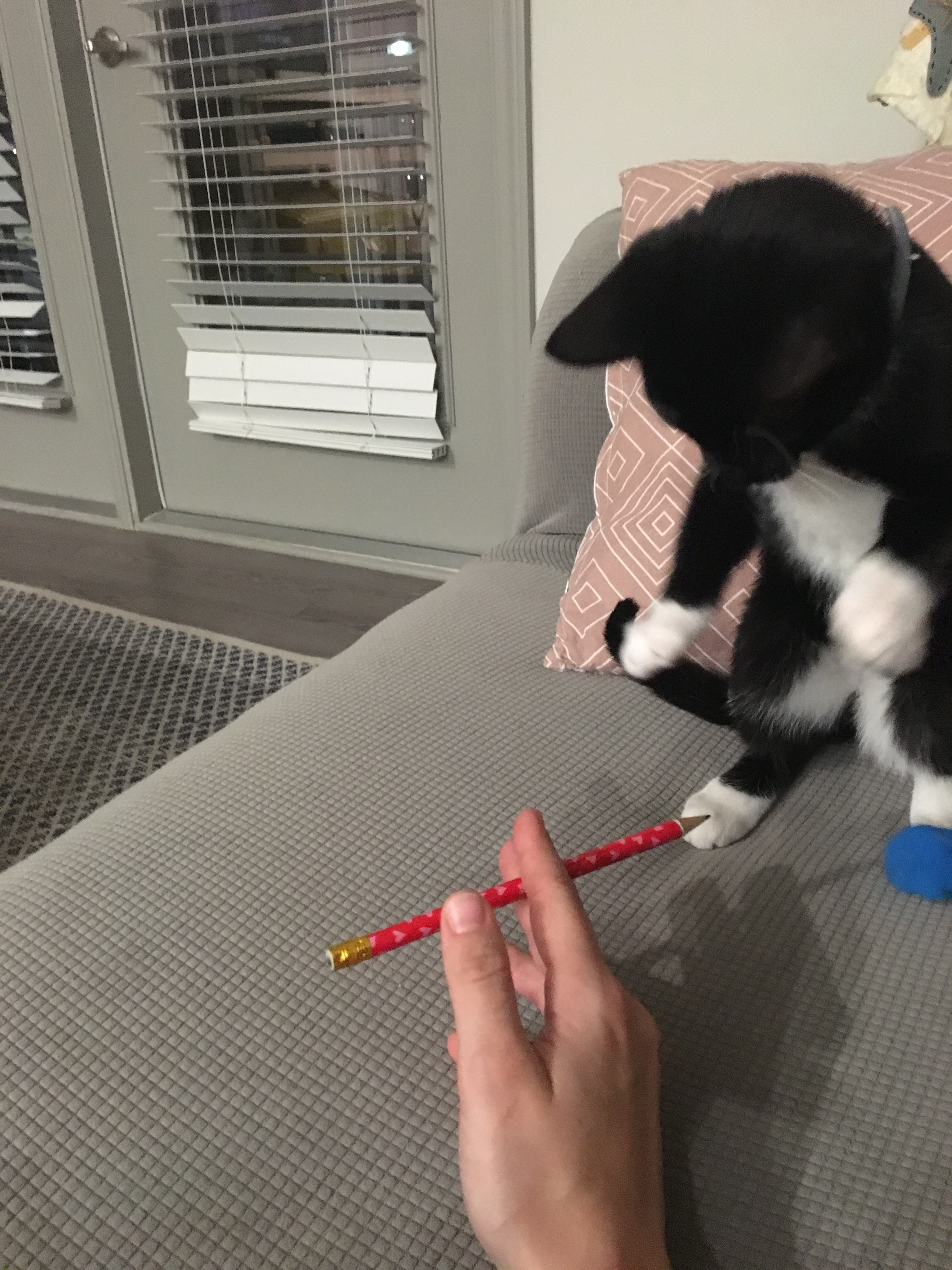 Start with waving a pencil to get her attention! Eventually she’ll want to learn to add, right?